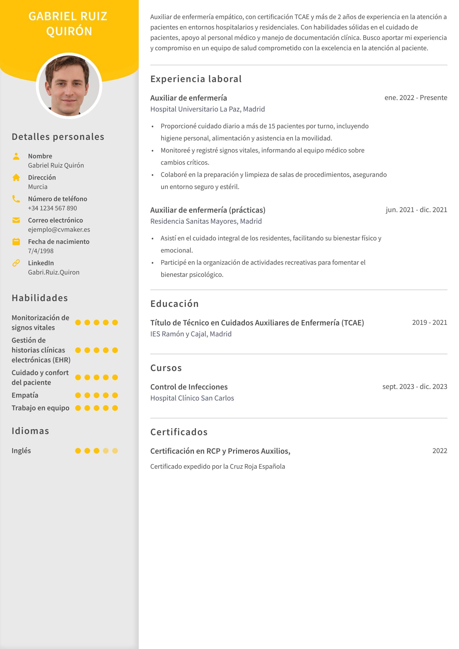 Y si ya tienes experiencia previa en esta tarea, seguro que al revisar nuestro ejemplo comprobarás la importancia que tiene incluir cierta información, además de conseguir inspirarte para mejorar aún más tu curriculum auxiliar enfermeria.