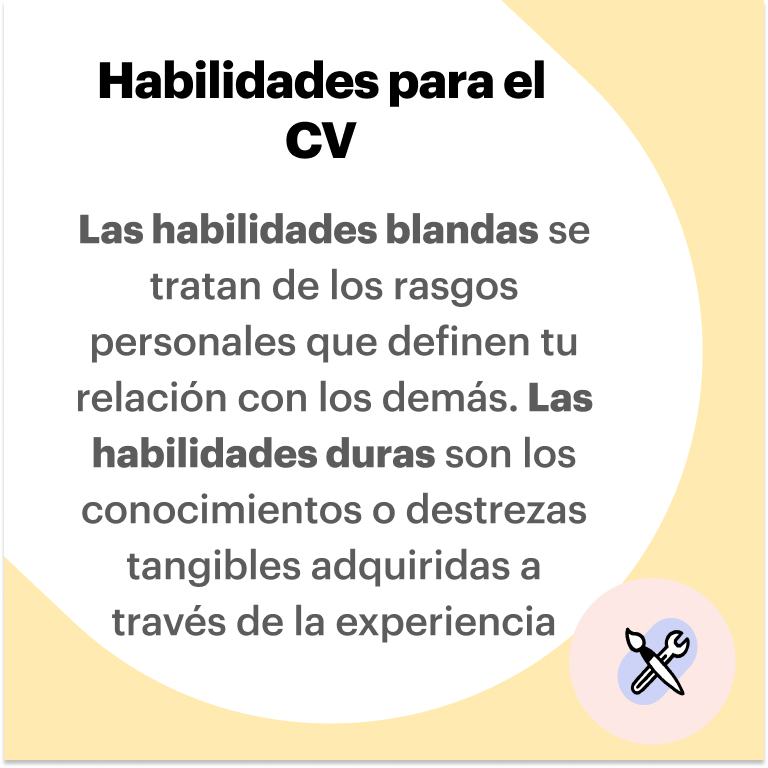 Habilidades: esta sección debe enumerar las habilidades clave relevantes para un puesto de asistente de enfermería. Incluye tanto habilidades duras (como técnicas de atención al paciente, terminología médica y gestión de registros médicos electrónicos) como habilidades blandas (como empatía, comunicación y trabajo en equipo). Adapta tu lista de habilidades para que coincida con la descripción del trabajo, centrándote en las que tienen más demanda.