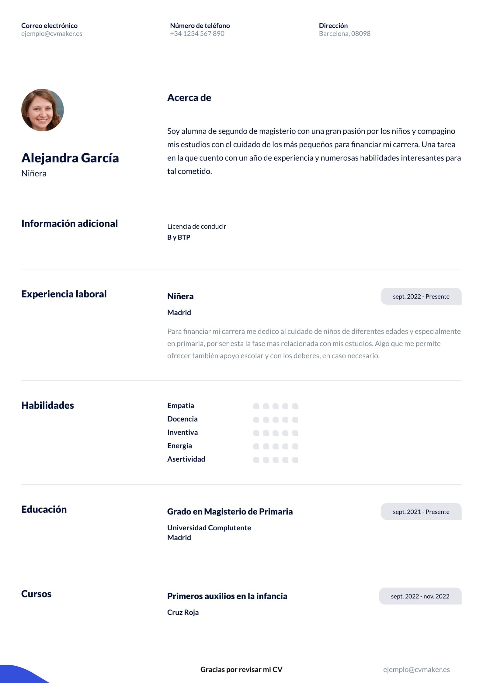La plantilla a elegir dependerá un poco de nuestras preferencias y también de la edad de los menores, dado que cuanto más pequeños sean, más podemos enfocarnos al segundo planteamiento. En cualquier caso, dentro de CV Maker vas a encontrar más de un ejemplo de currículum de niñera interesante, con plantillas adecuadas para ajustarlas en cualquiera de las dos líneas que estamos planteando.