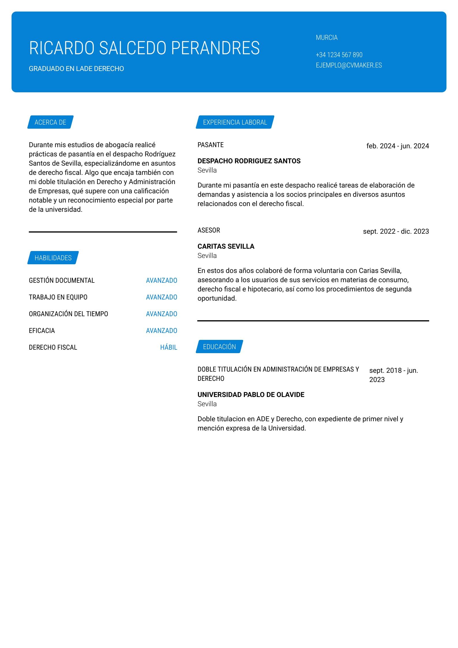Durante mis estudios de abogacía realicé prácticas de pasantía en el despacho Rodríguez Santos de Sevilla, especializándome en asuntos de derecho fiscal. Algo que encaja también con mi doble titulación en Derecho y Administración de Empresas, qué supere con una calificación notable y un reconocimiento especial por parte de la universidad.